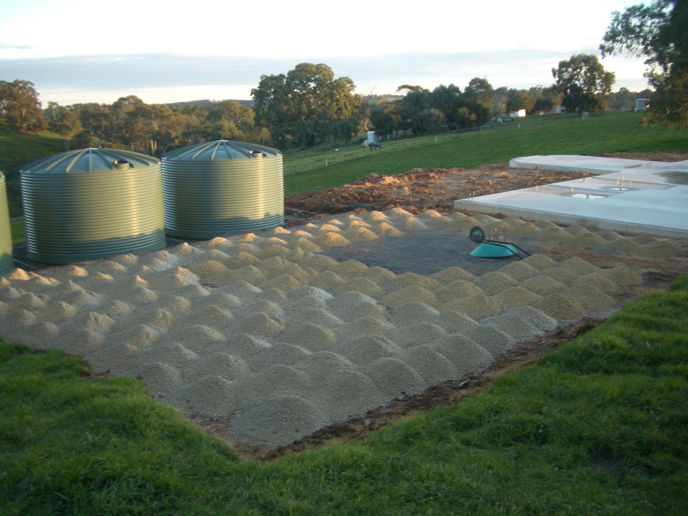 On the non format side of things we have quite a few other things on the go. Our rain water tanks have been installed! 3 tanks at 23650 litres each! The base for these took quite a while to prepare. 12 tonnes of dolamite sand was used to level up the area and also to provide a solid base for the tanks. After all it’s 1tonne per 1000 litres of water. Hence that’s a total of 72 tonnes we have in an area of 14 metres by 4 meters. We certainly don’t want them to move!