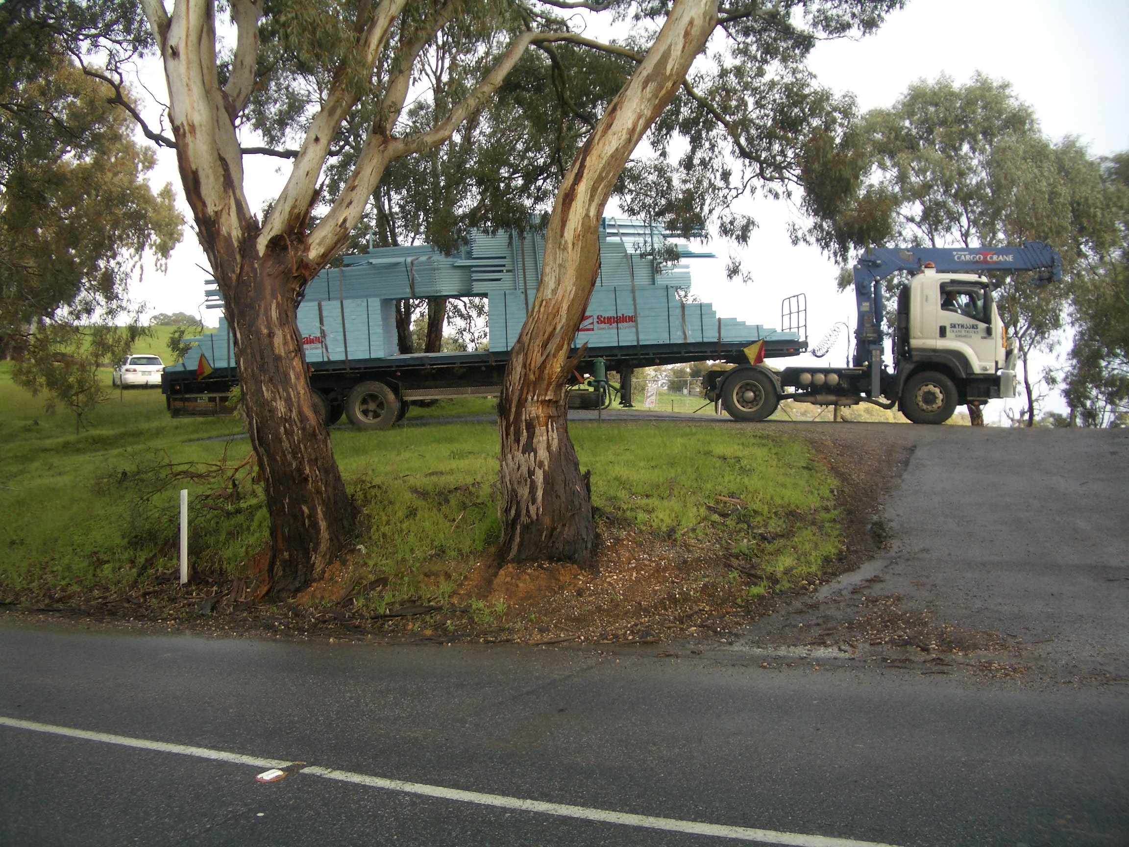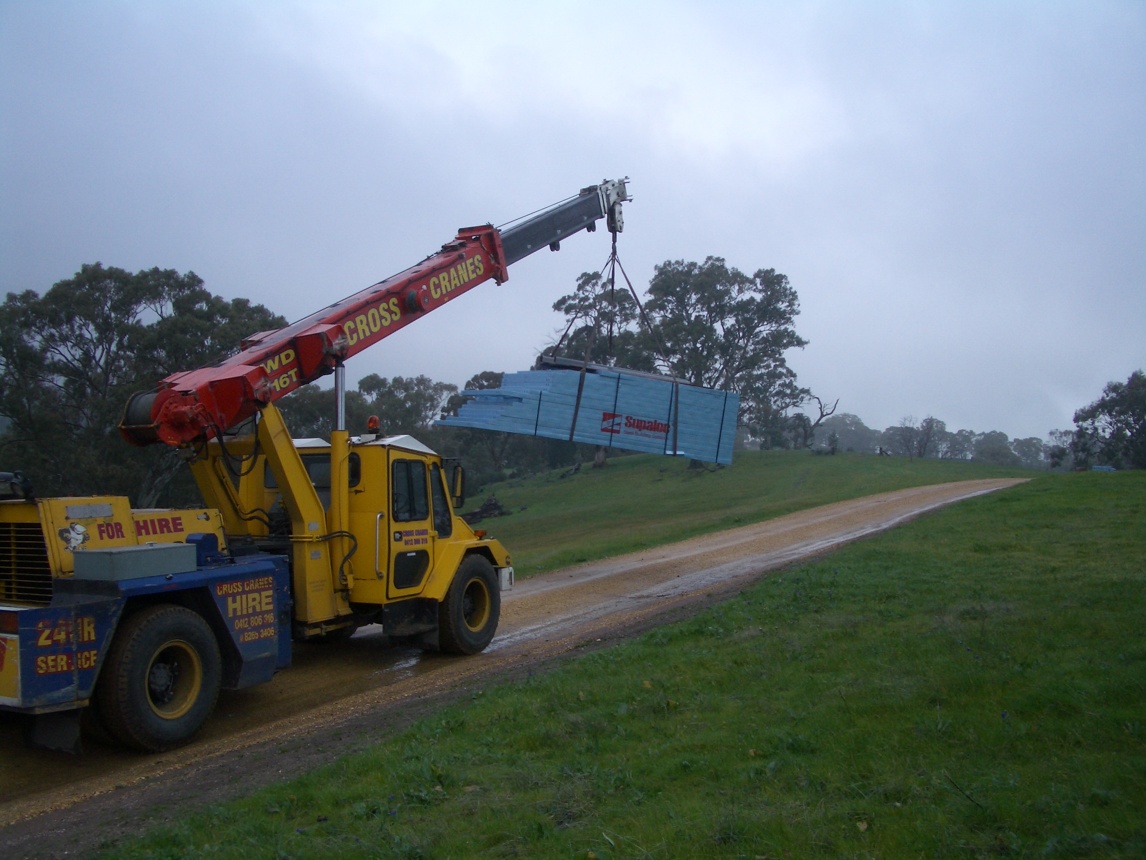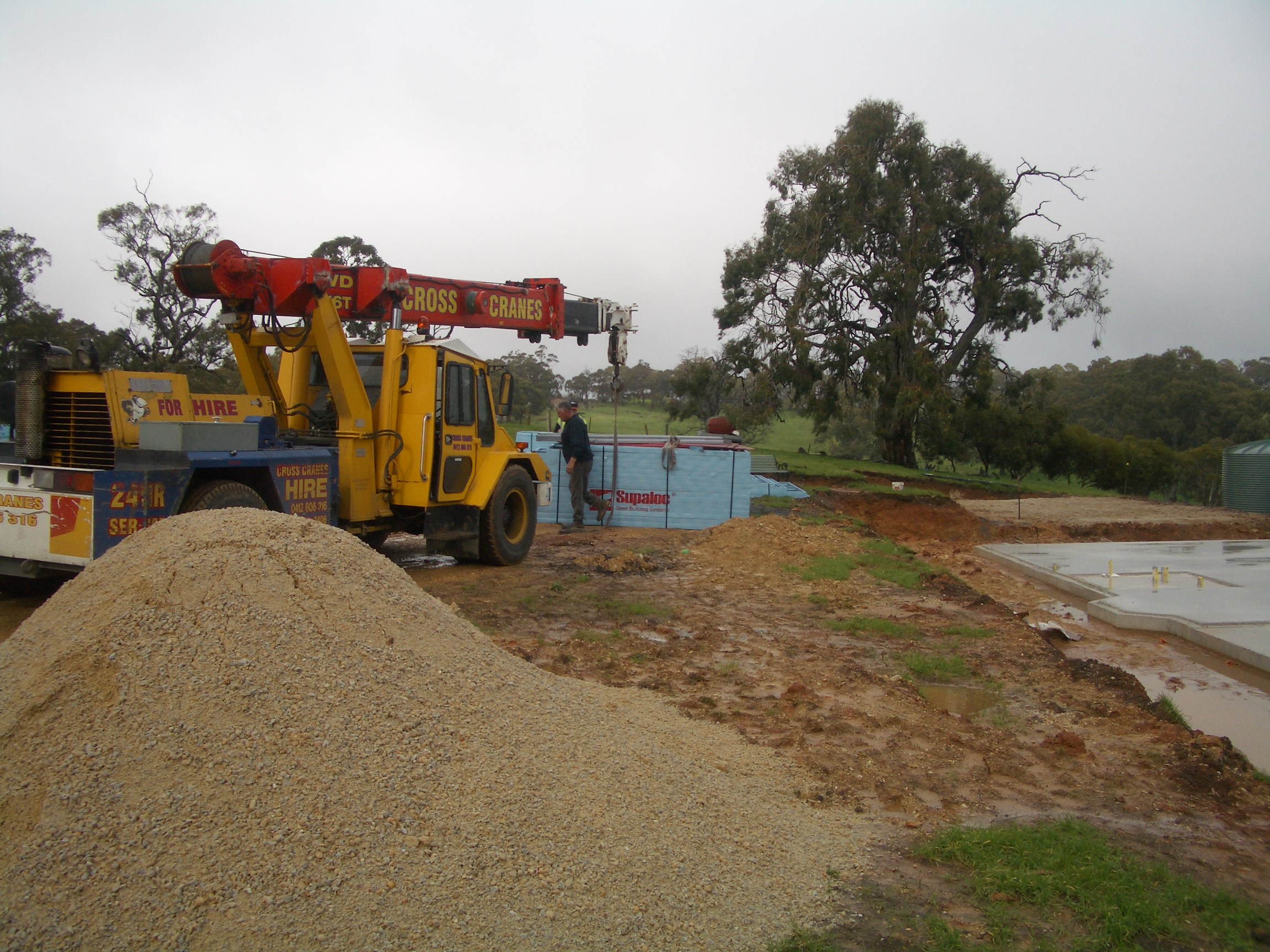 Format’s next step was delivery of the steel frame. Sadly the weather has not played well. Between the slab being poured and the steel being delivered there’s been the wettest July in 13 years. Over 80mm! This has played havoc with both our driveway and also with Format’s delivery of the steel. The problem came down to the ability of a semi to turn at the end of the access track. Sadly the water made it impossible for a truck to turn. Added to Format changing the delivery date from one where there had been 5 days of fine weather to one where there had been 20mm of rain. Hence a crane was needed – At our cost 🙁 At least now the steel frame is ready to go up. Sadly it’s still too wet around the edges of the house for a bobcat to clean up and lay some more rubble (even though the rubble has been delivered).